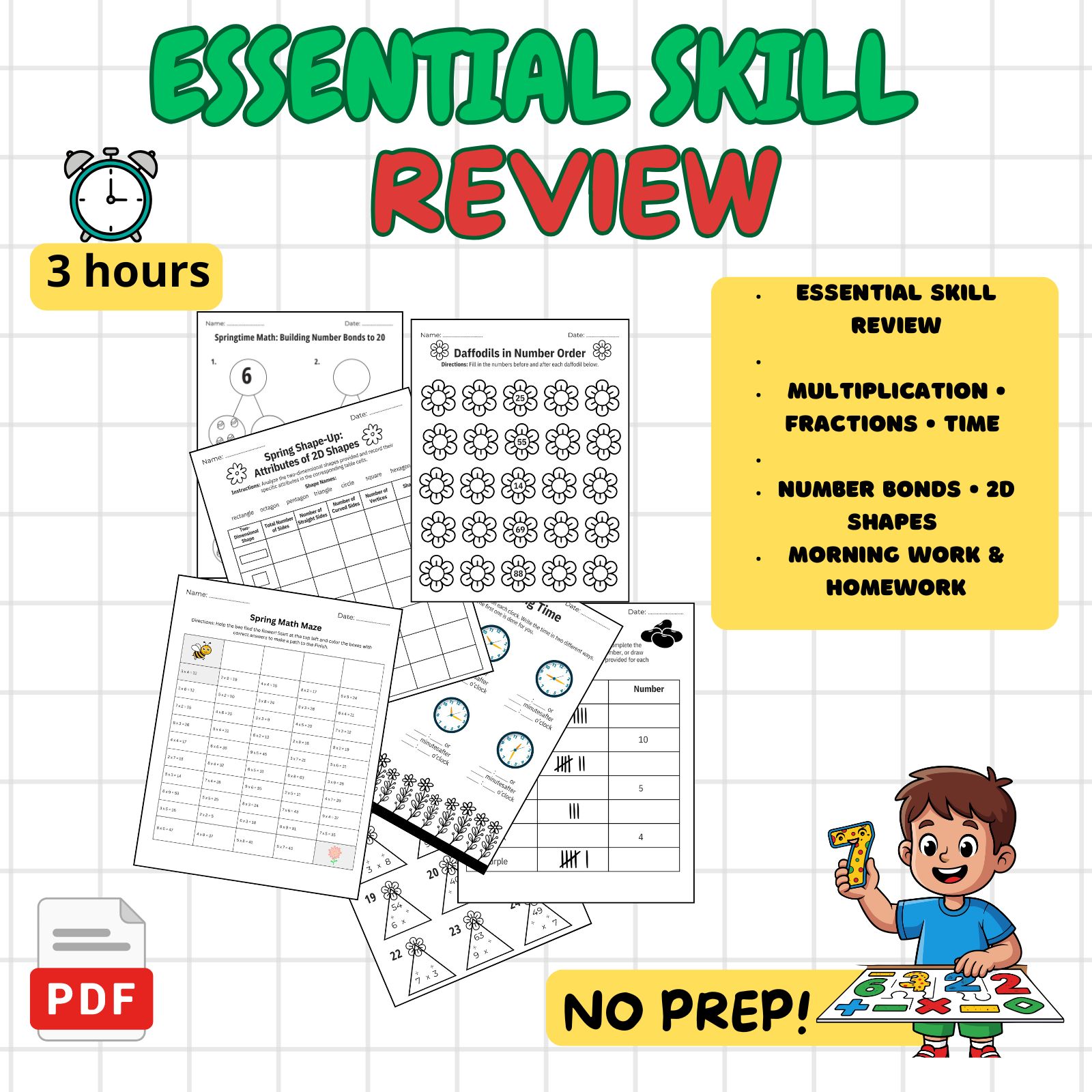 Spring Math Review Pack | Grades 1-3 | No Prep Multiplication Fractions & More